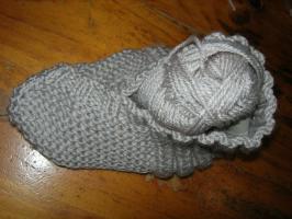 Chaussons à tricoter en côtes et point mousse pour le dessus et au point que vous voulez pour la semelle. Choisissez la pointure et utilisez le fil à tricoter que vous voulez.