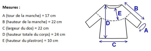 Echantillon : 19 mailles (en jersey ou au point mousse) doivent donner une largeur de 10 cm