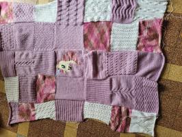 Ce plaid mesure environ 1 m x 1 m et il est proposé avec le fil Canada de Lammy aux aiguilles à tricoter n°4,5. Il est constitué de 49 carrés assemblés par des coutures.