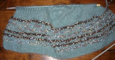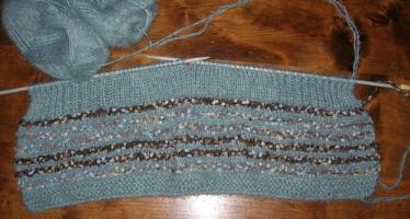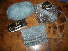 Ce snood tout doux est à tricoter aux aiguilles n°6 avec 1 pelote "Diva" de Lammy et 1 pelote "soft fun" de Lammy.