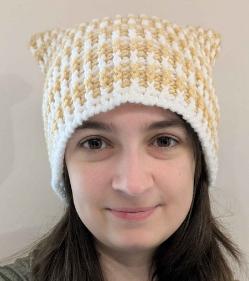 Fournitures : un peu de fil poilu blanc + un peu de fil N°1 coloris 062 + 1 pelote N°1 coloris écru 016 + un peu de noir + 2 boutons aimantés + 1 paire d’aiguilles à tricoter n° 3,5 + 1 aiguille à coudre